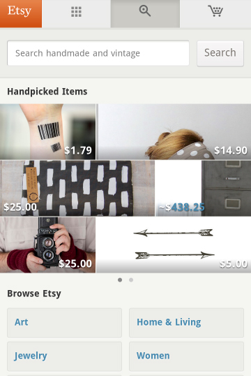 If you’re designing a mobile site, emulating app design delivers convenience and familiarity for users. App style icons and buttons in your mobile site could make users feel more at home on their mobile device. Etsy does this well, using four large app-style icons for menu navigation on the top of its single column layout.